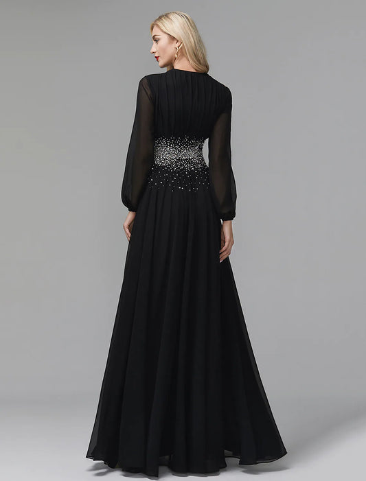 A-Line Evening Dress Celebrity Red Carpet Formal Gown Black Wedding Guest Floor Length Long Sleeve V Neck Chiffon with Sequin