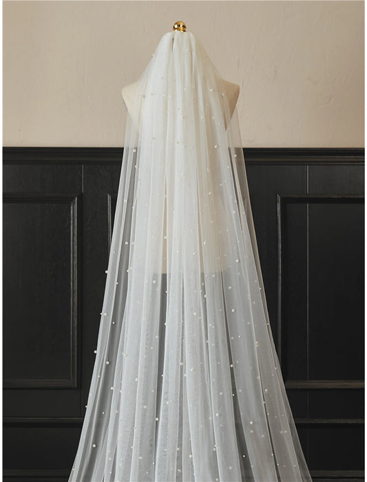 AerbaDress One-tier Pearls Wedding Veils with Faux Pearl 118.11 in (300cm) Tulle