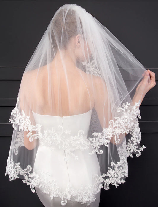 AerbaDress One-tier Lace Edge Wedding Veil Chapel Veils with Appliques Tulle
