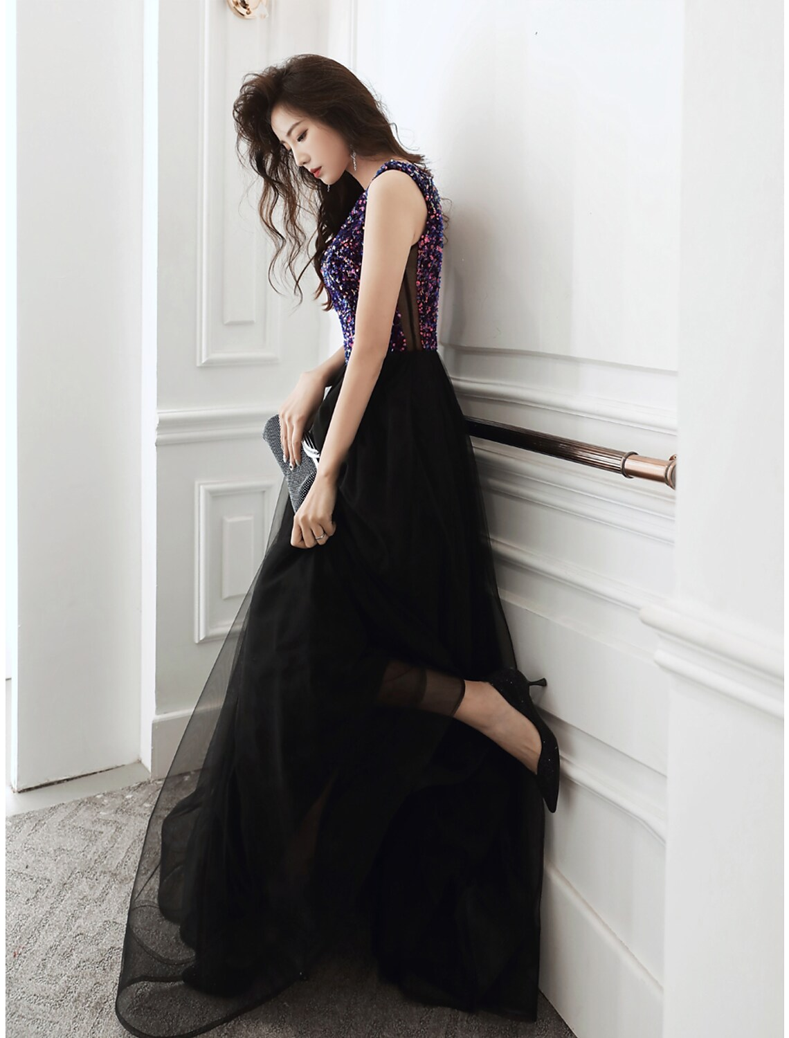 A-Line Glittering Wedding Guest Prom Dress V Neck Sleeveless Floor Length Sequined with