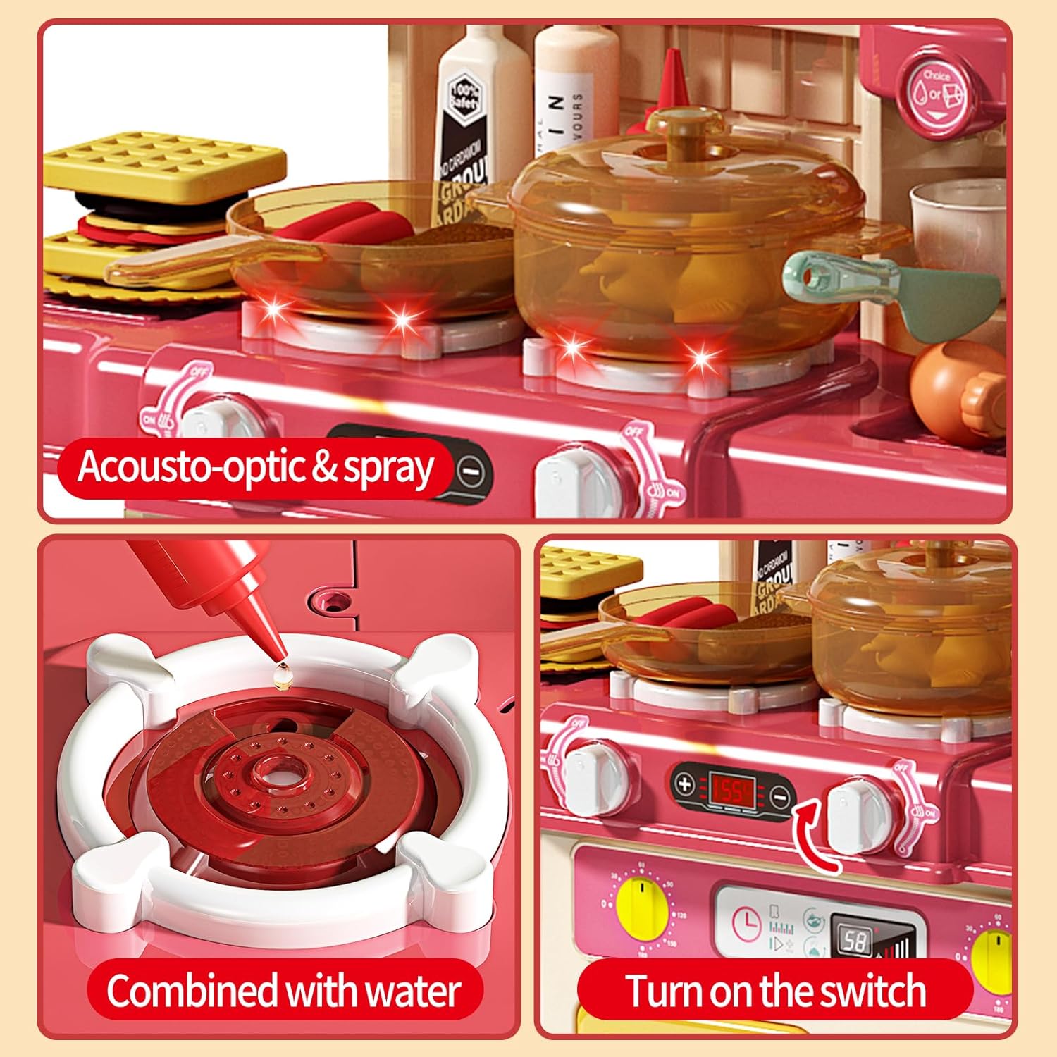 【Electronic Stovetop with Steam & Sound & Light】Place a pot or pan on the stove and turn it on, the stove will light up and make a sound to mimic the real firing stove.Additionally, use the red bottle to add water into the hole of stove and spray will comes out while cooking, adding a lot more fun