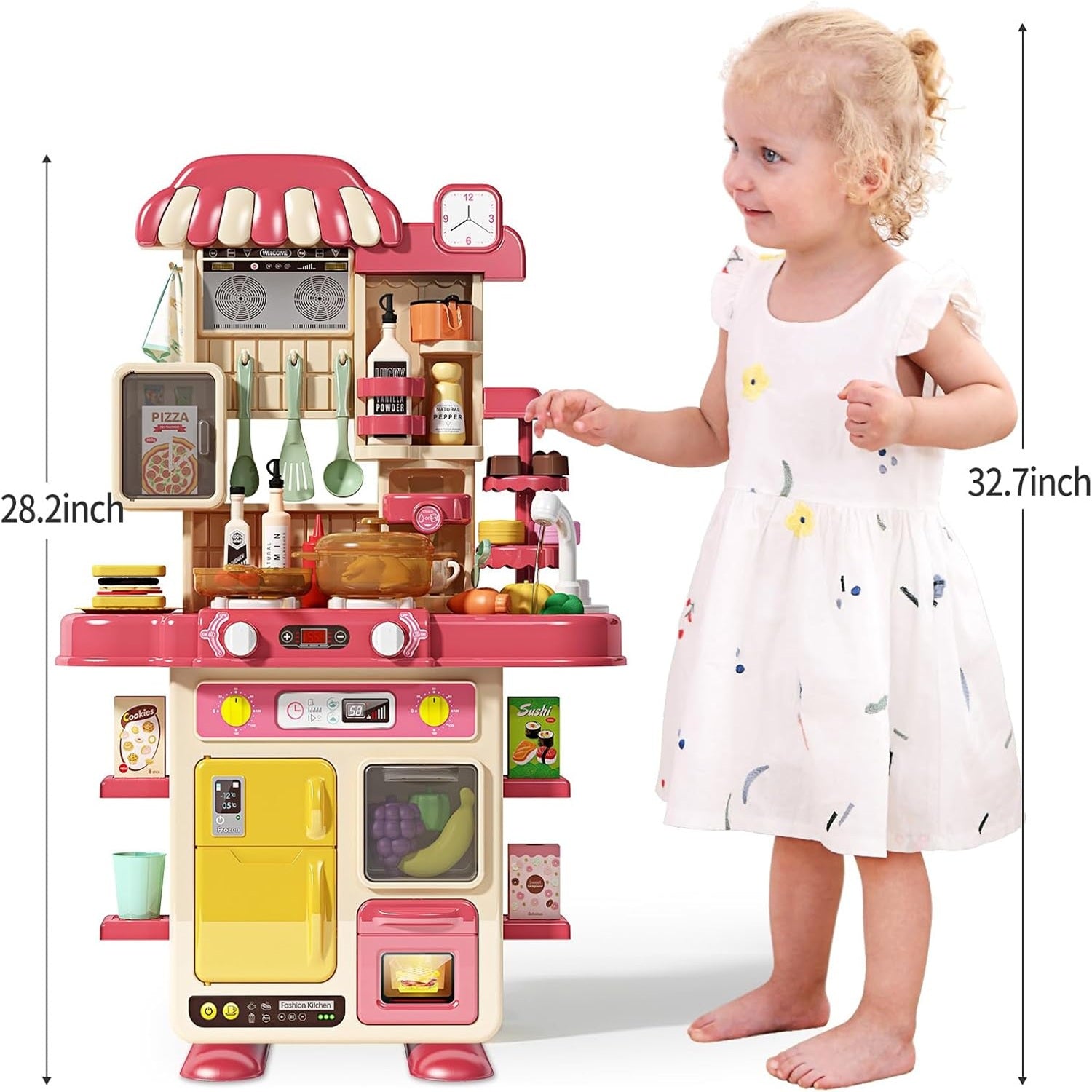 【Realistic Kitchen Set Toys of High Quality】The play kitchen with sound and lights is made of safe, child-friendly and durable material.Height 28.2 inches,whole figure is also well designed, glaring with vitality and childlike delight,which will absolutely bring great fun to your little guys.