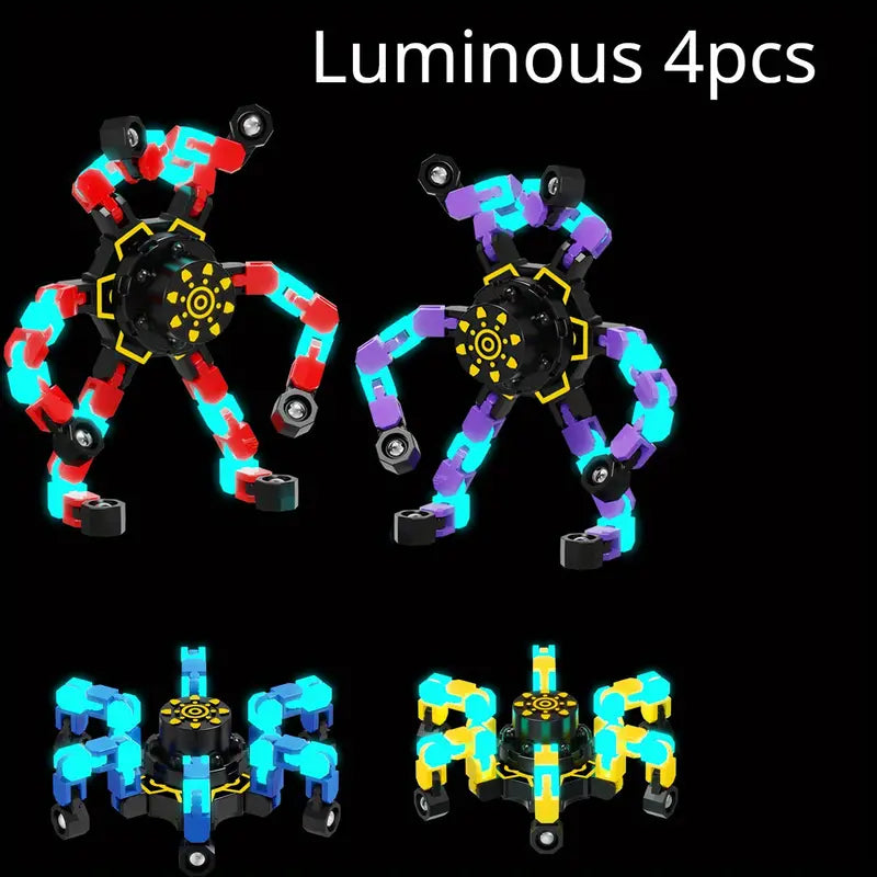 【Transformable Finger Gyros】4 colors (red yellow blue purple) finger spinners included. Each fidget spinner has six deformable chains. Each of the links can pivot and lock into 5 positions, you can create any shapes you want, such as various shapes of spinners, robots and even mobile phone holders. It can also exercise your kid’s hands-on ability, hand-eye coordination and logical thinking ability by changing the shape of the toys