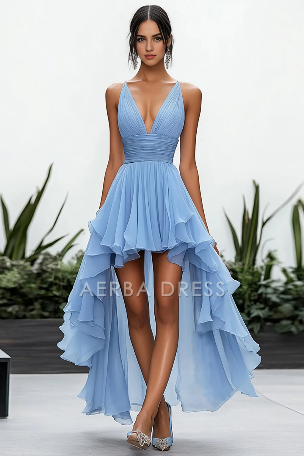 AERBA DRESS Formal Wear Dresses A Line Deep V-Neck High-Low Chiffon Ruched Fashion Prom Dress