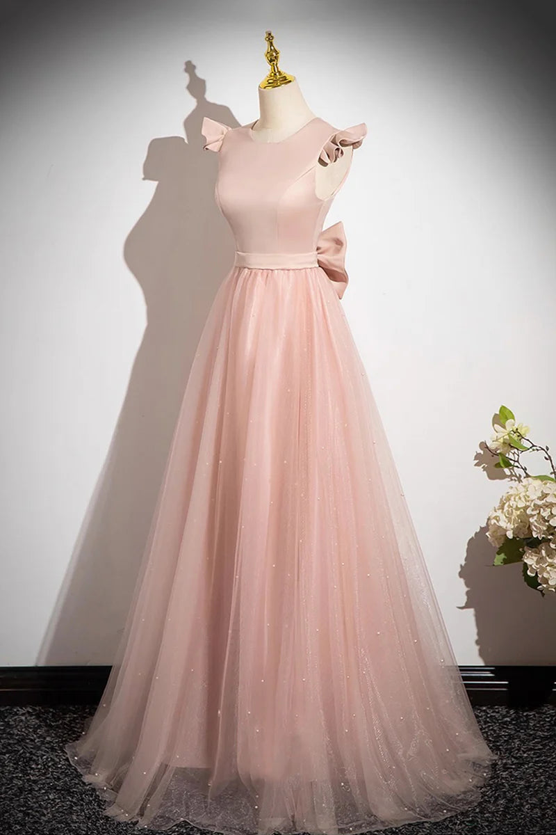 Elegant Pink Satin Tulle A Line Round Neck Sleeveless Beadwork Back Waist Bow Beautiful Long Prom Dresses Formal Graduation Dress Evening Dresses