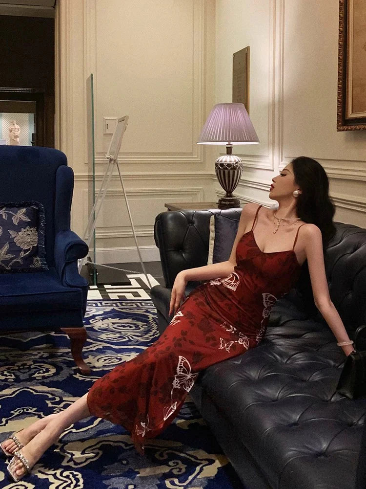 Aerba's glamorous prom dress features a sleek mermaid silhouette with a romantic V-neckline, crafted from lightweight red chiffon with a bold white butterfly print. The bodice is supported by thin spaghetti straps, while the bias-cut floor-length skirt includes a discreet side slit that adds allure and movement. The semi-sheer fabric and striking print create a dramatic, eye-catching aesthetic that is both modern and feminine.