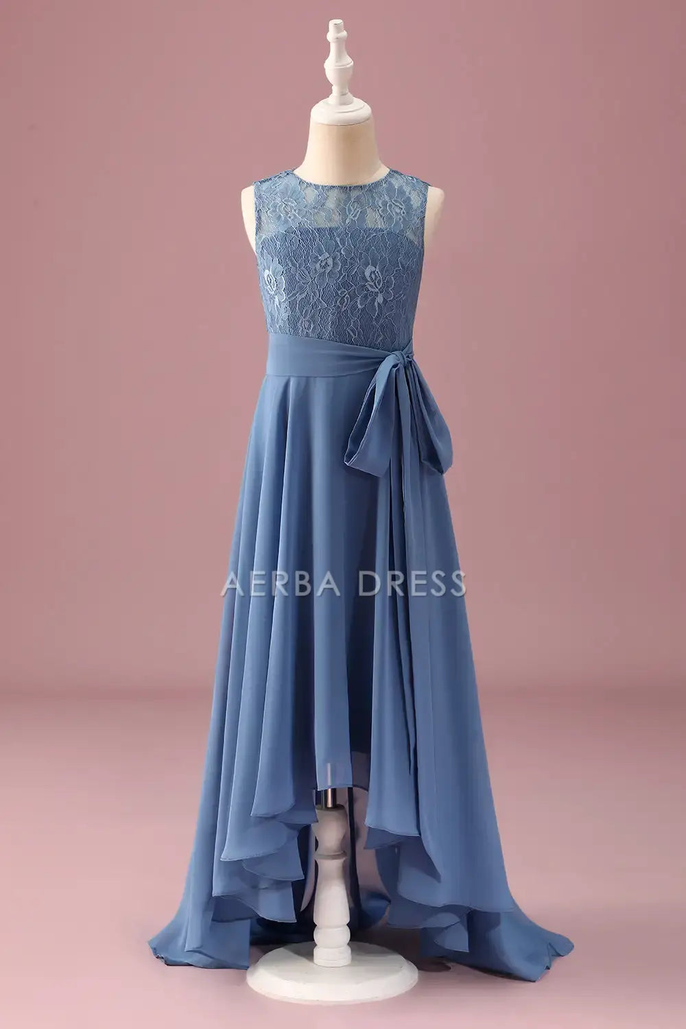 Junior Bridesmaid Dress A Line Lace Round Neck Sleeveless Ruffles With Belt High Low Hemline Girl Formal Dress