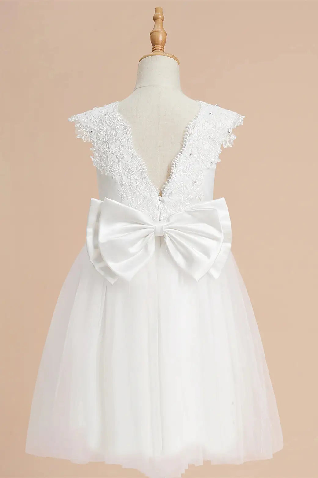 Wedding Flower Girl Dress Elegant A-Line Round Neck Sleeveless V-Back Bow With Appliques Cute Girl Communion Formal Dress Princess Dress