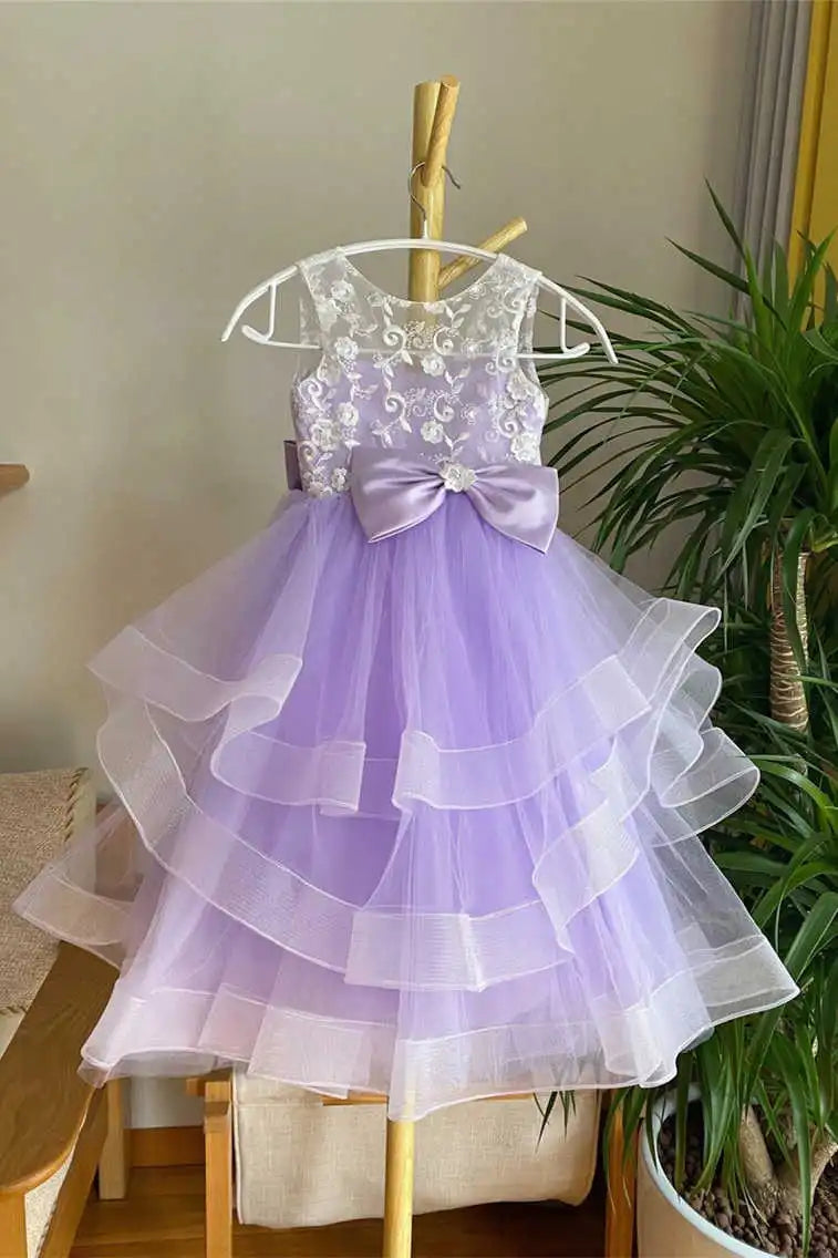 Wedding Flower Girl Dress Elegant A Line Tulle With Lace Top Tiered Ruched V back Bow Exquisite Girl Communion Formal Dress Princess Dress